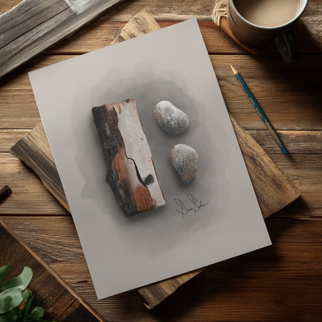 Printed on cold press paper with a beautifully textured surface, Birch & Stones captures the balance between strength and stillness. The pale birch and smooth stones evoke quiet forest mornings — grounding, simple, and timeless. It’s a gentle reminder that calm isn’t found in stillness alone, but in the harmony between rough and smooth, light and shadow.
